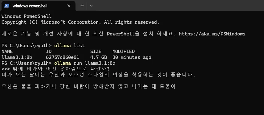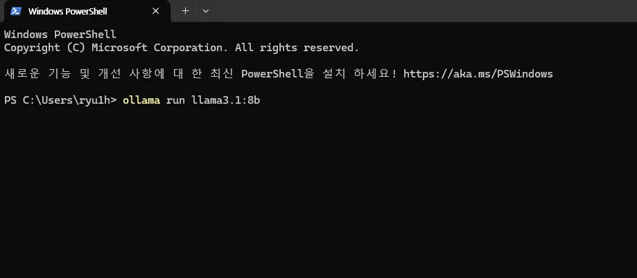 PowerShell에서 다음 명령어를 실행해서 llama3.1 8b를 설치합니다.