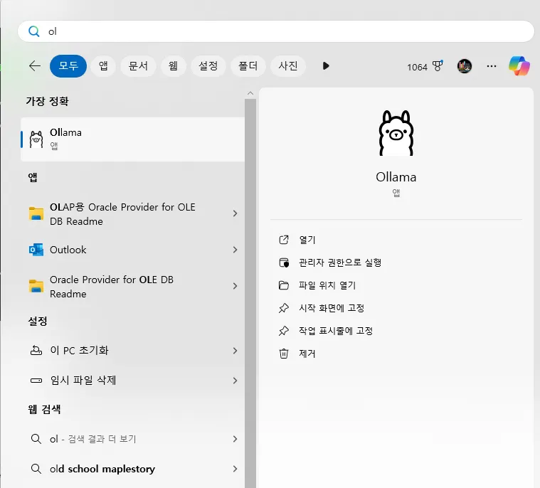 설치가 완료된 후 설치된 ollama를 찾아서 실행