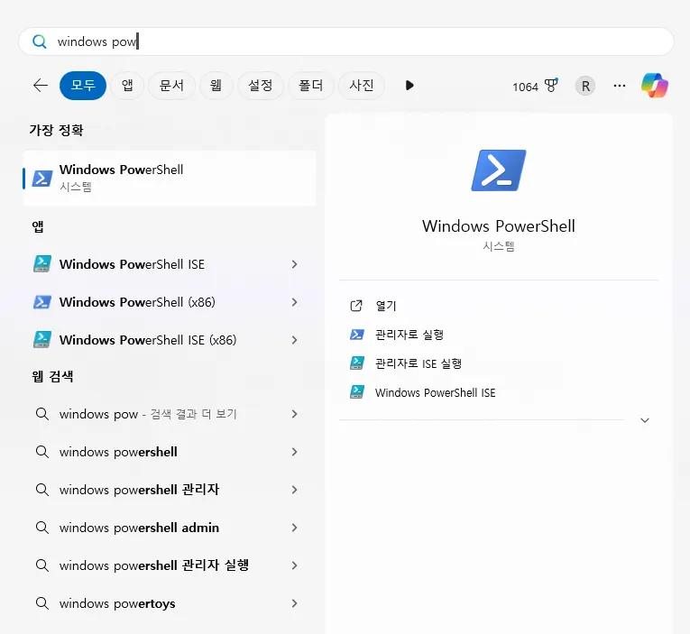 또는 윈도우즈 PowerShell을 바로 실행해도 됨.