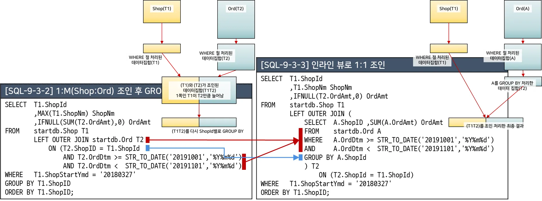 인라인 뷰에서 데이터를 GROUP BY 처리한 후에 조인을 할 수도 있다. 아래 SQL은 Ord 테이블을 인라인 뷰(T2)에서 ShopId로 GROUP BY 한 후에 조인을 하고 있다. 이와 같은 패턴은 조인을 조금 더 이해하기 쉽게 만들어주기도 한다.